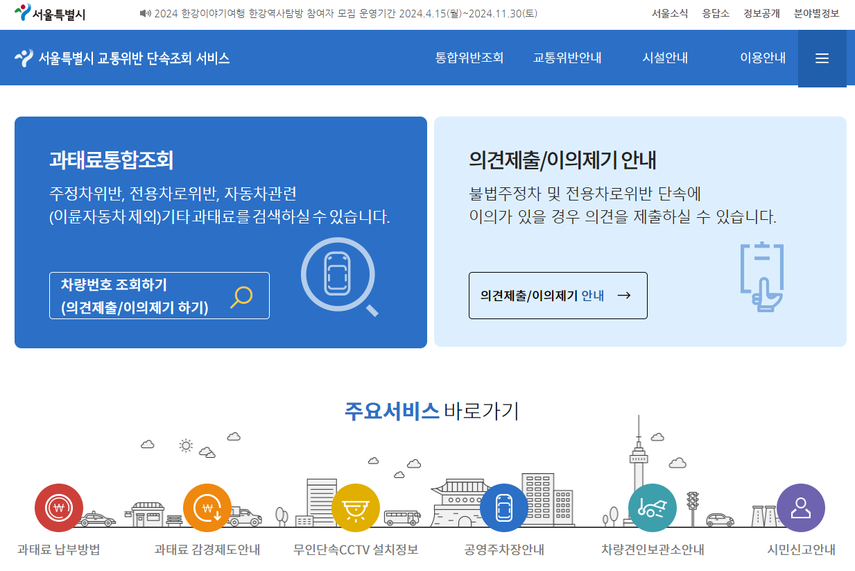 서울시 내의 주차위반 과태료 조회는 서울특별시 교통위반 단속조회 서비스를 통해 조회해보실 수 있습니다.