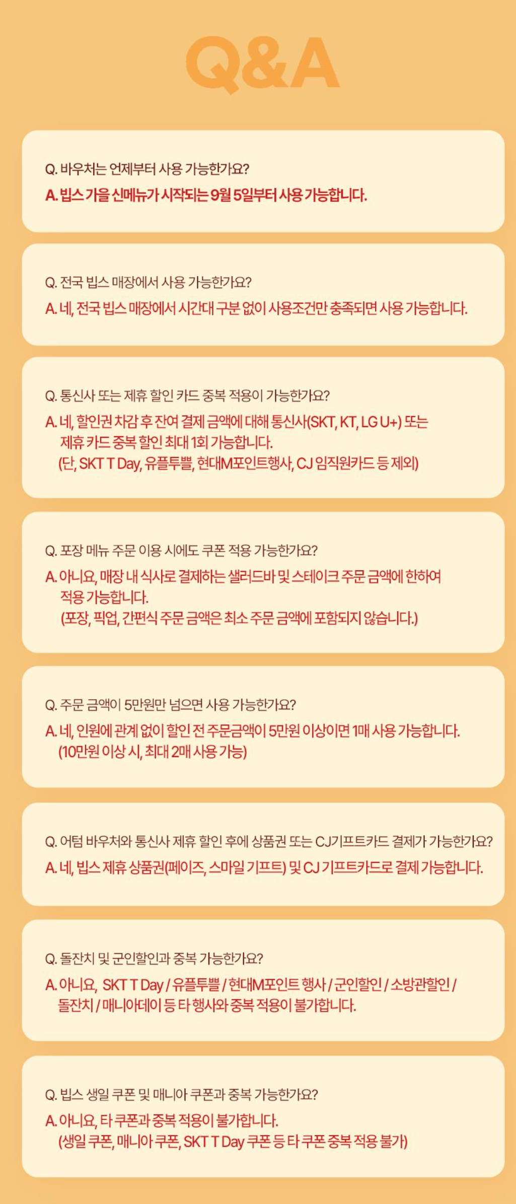 빕스 어텀바우처 사용에 궁금하신 질문들도 아래에서 한번에 확인해보세요!