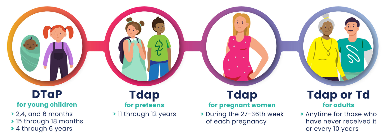 이후 성인은 10년 주기마다 Tdap 백일해 예방접종을 해야합니다. 이렇게 전염률이 급격히 높아지는 시기에는