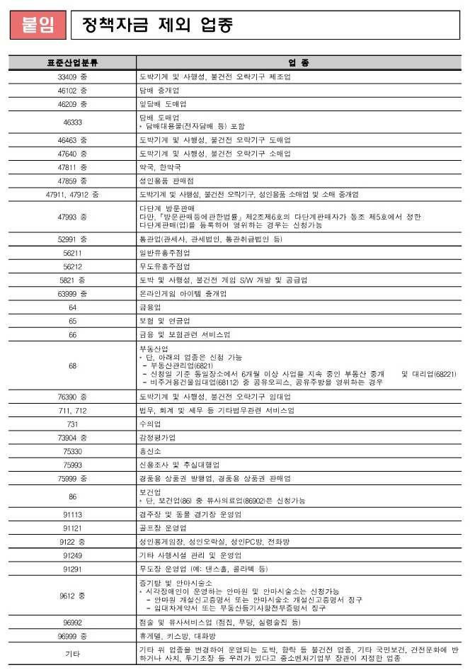 아래의 소상공인 전기요금 특별지원 정책자금 제외 업종에 해당되지 않은지 확인해보시기 바랍니다.