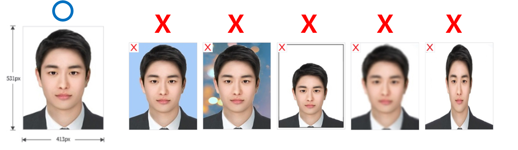 사진의 규격은 413x531 pixel 을 권장하며, 가로 395~431pixel, 세로 507~550 pixel 이내 범위의 사진으로만 신청이 가능합니다.