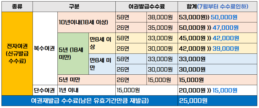 신규발급의 경우는 아래의 수수료 인하, 재발급의 경우엔 여권의 남은 유효기간만큼의 발급시에는 25,000원입니다.