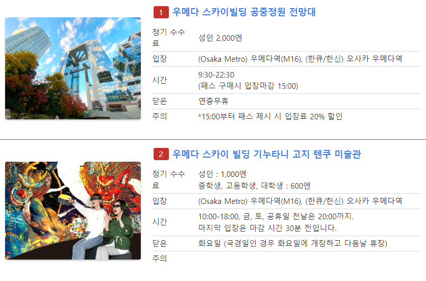 | 무료 이용 가능한 시설 | 오사카 성을 포함한 40개 이상의 시설 | 쓰텐카쿠 타워를 포함한 20개 이상의 시설 |
