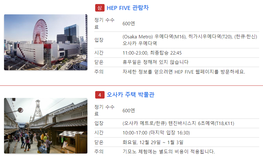 또한 오사카 시내의 관광명소등에서 입장료를 할인 받을수도 있는데요.