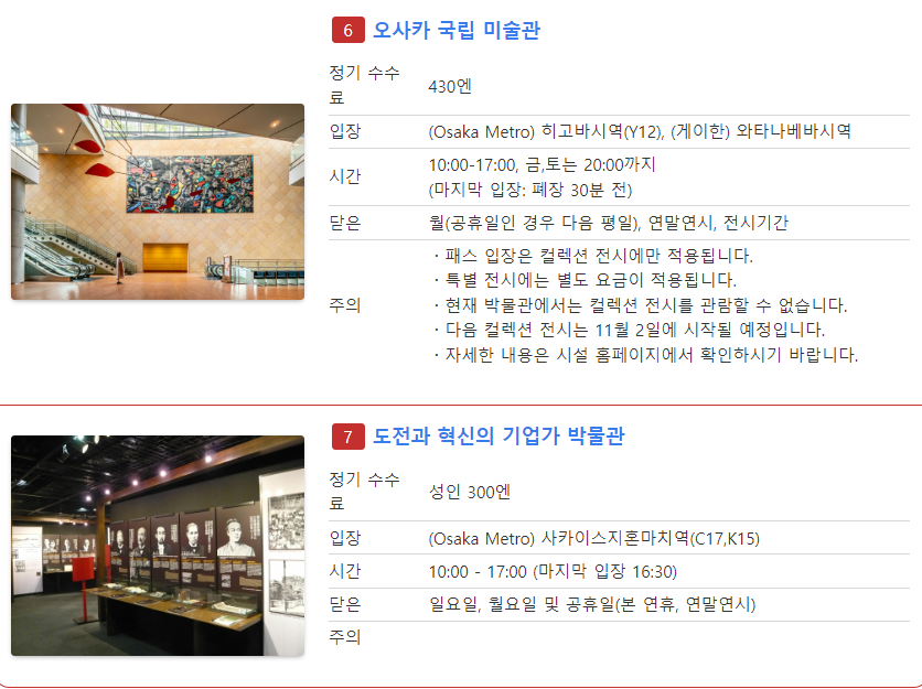 시설의 무료입장을 하고 싶으신 분들은 오사카 주유패스나 오사카e패스(+지하철패스)를 구입하여