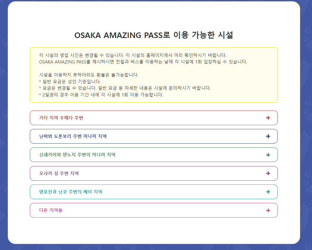 오사카 내에서 지역별로 이용할 수 있는 시설이 묶여있어 일일 동선대로 방문일정을 계획해볼 수 있습니다.