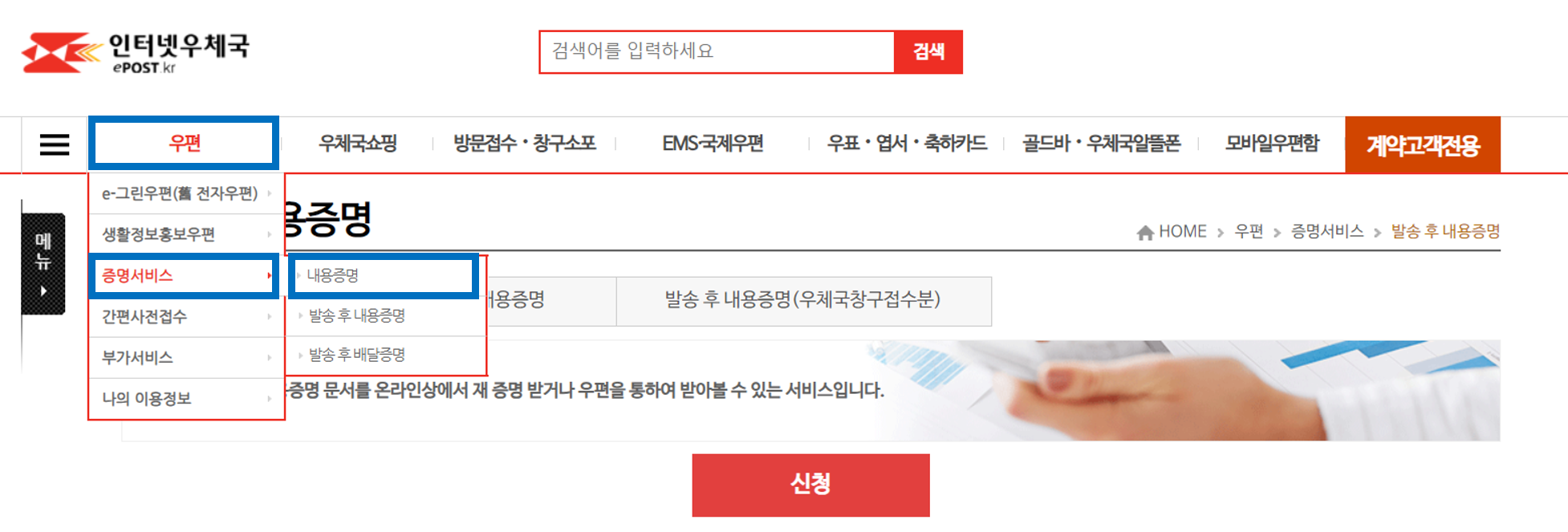 > 우편 > 내용증명 선택 > 문서 작성 후 신청