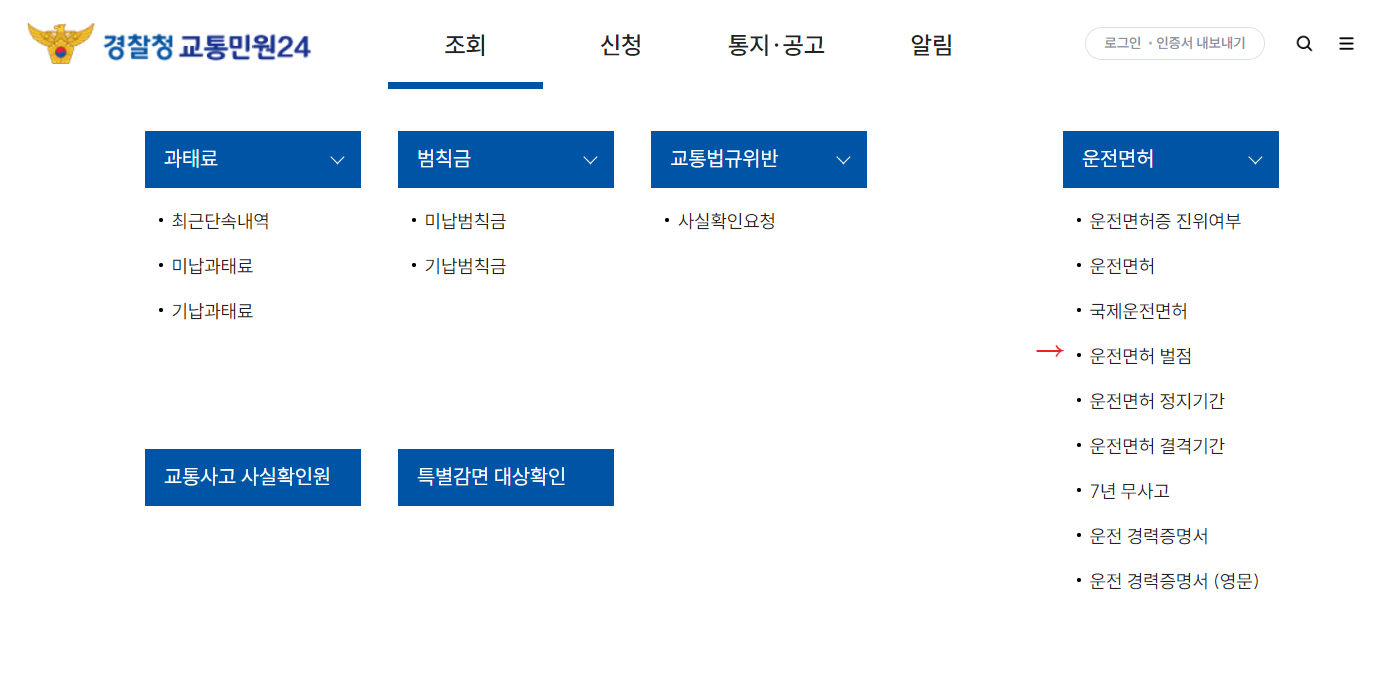 운전면허에 대한 벌점이 궁금하시다면, 경찰청 교통민원24 이파인 홈페이지에서 조회해보실 수 있습니다.