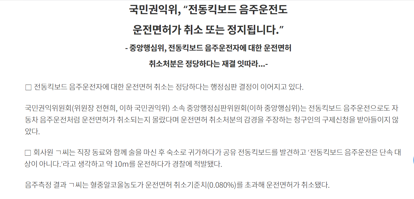 근래에 국민권익위원회에 따르면 전동킥보드 음주운전도 운전면허 취소 혹은 정지가 될 수 있으며,