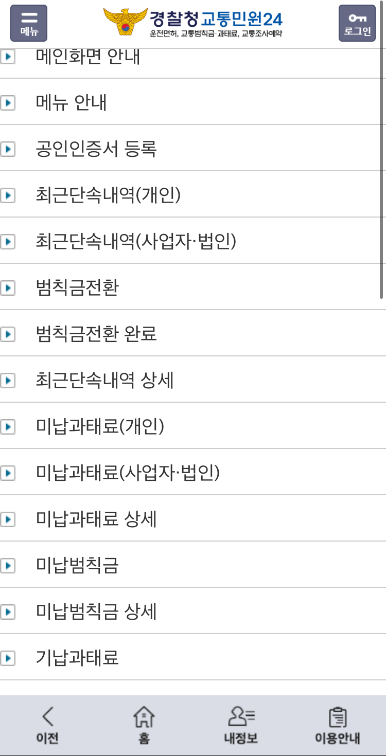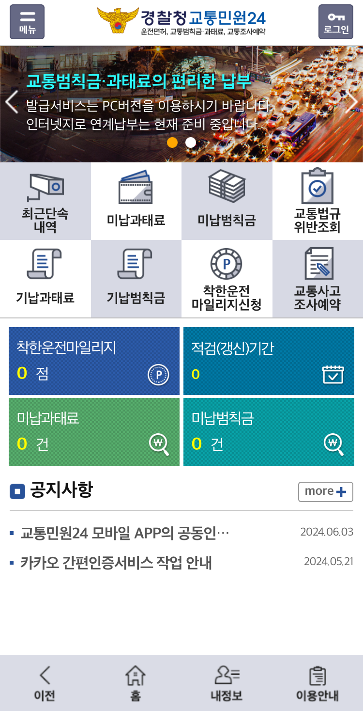 모바일앱인 경찰청교통민원24 에서도 차량 번호로 과태료 조회 뿐만 아니라 각종 교통민원들을 처리하실 수 있습니다.