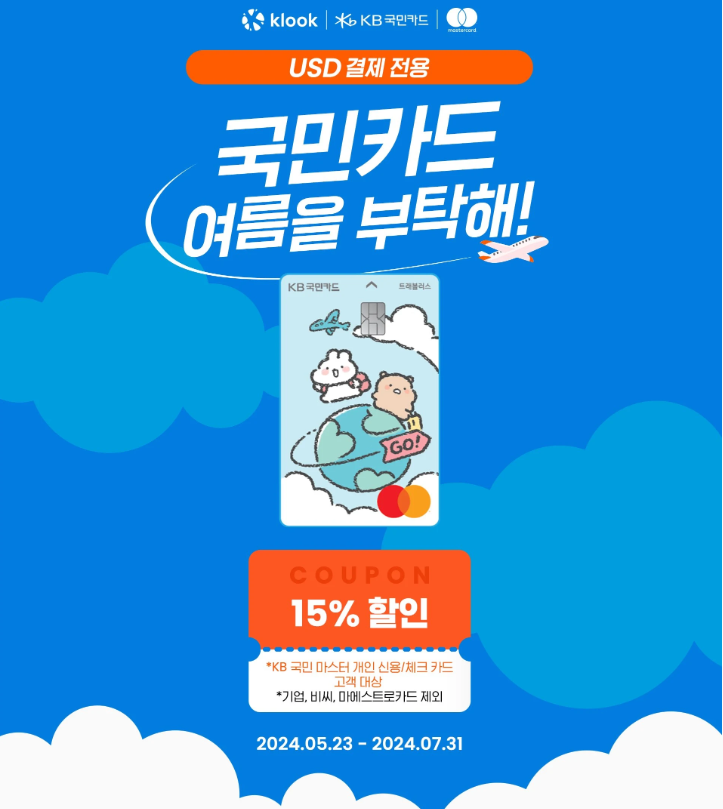 국민 마스터카드로 클룩 할인쿠폰 7월 적용을 받으실 수 있습니다.