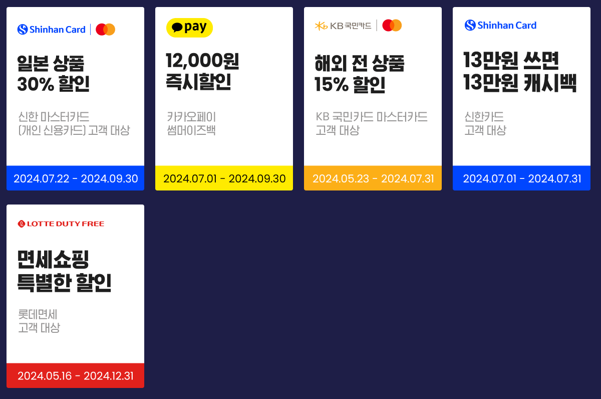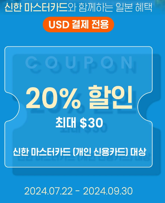 일본여행을 계획 중이시라면 9월 30일까지 20% 할인적용 받을 수 있는 신한 마스터카드로 결제 하시면 되겠습니다.
