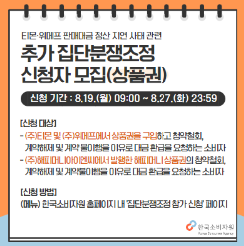 한국 소비자원에서 티몬 위메프에서 미정산금 대금 환급에 대한 집단분쟁조정 신청을 받고 있으며,
