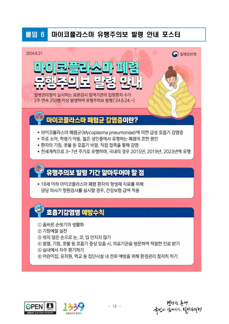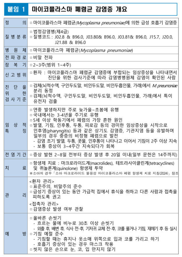 특히 24년 6월 현재 백일해 와 함께 마이코플라스마 폐렴이 전년도 겨울과 비교해 1.7배의 감염환자가 크게 증가해