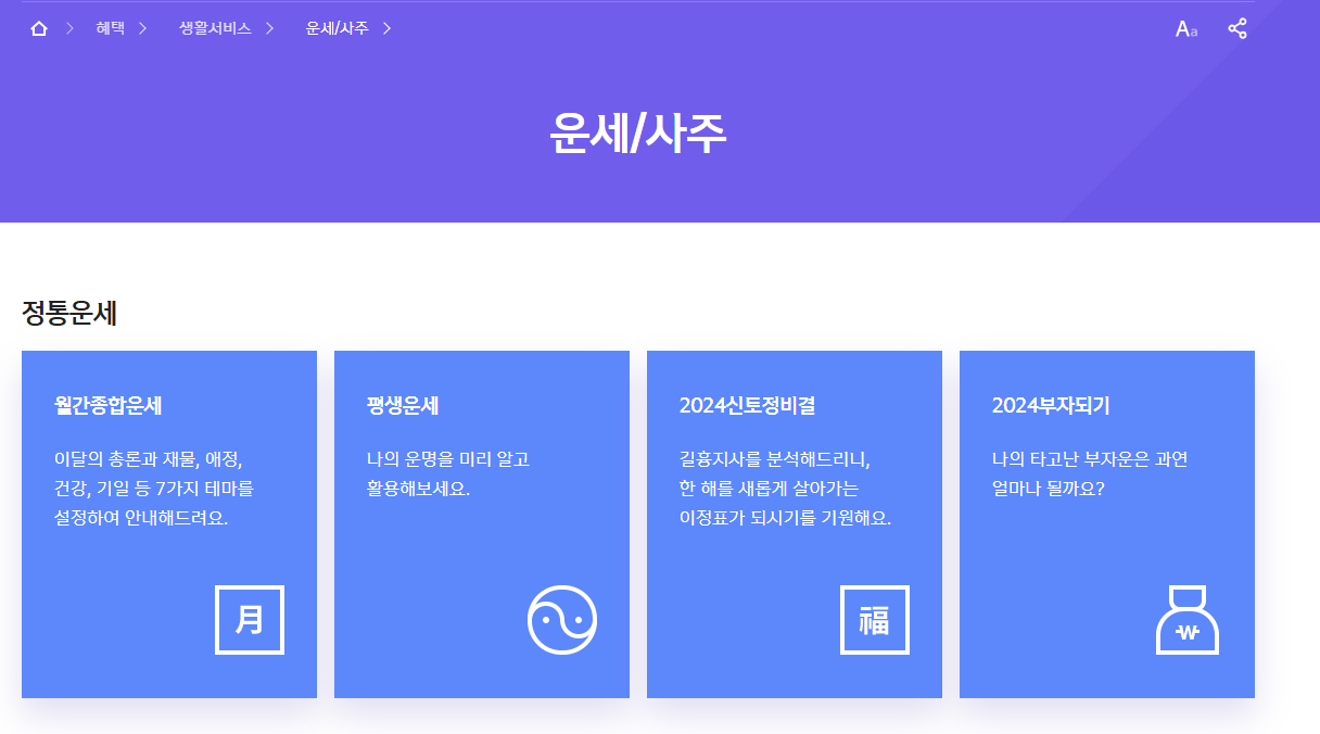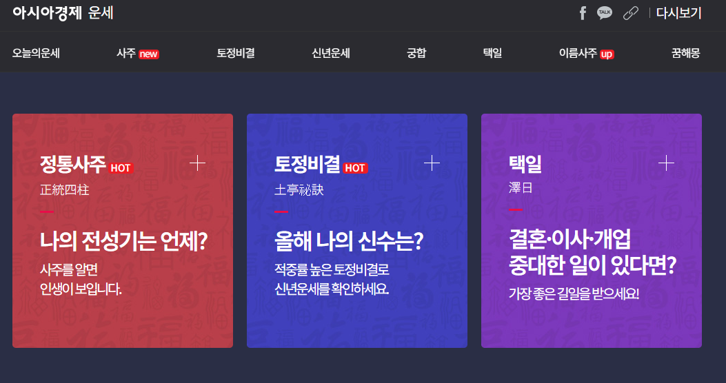 토정비결, 사주, 궁합 등 다양한 운세 서비스를 무료로 이용할 수 있습니다.