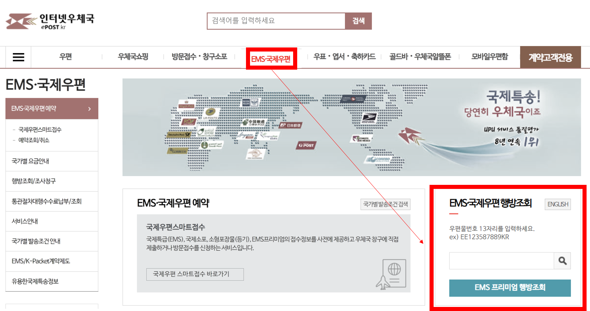 > EMS 국제우편 선택 > EMS 국제우편 행방조회를 통해 배송상태를 조회하실 수 있습니다.